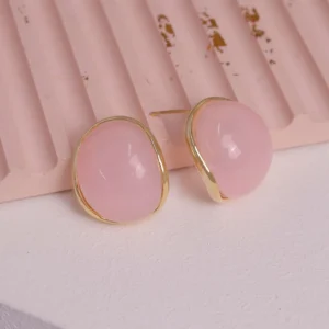 Delicados aretes con piedra semipreciosa engarzada en metal dorado, disponibles en tres tonos: verde, palorosa y rosado claro. Un diseño versátil y romántico.