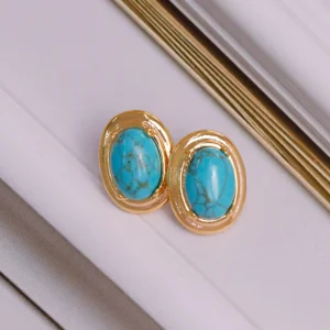 Deslumbra con estos elegantes aretes que combinan piedras de turquesa natural con un marco ornamentado en tono dorado. El diseño vintage realza la belleza de la turquesa con un borde decorativo que añade un toque de sofisticación clásica.