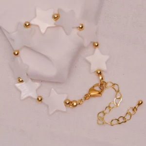Deslumbra con esta cautivadora pulsera ajustable que combina estrellas nacaradas blancas con detalles metálicos dorados. Su diseño armonioso alterna delicadas estrellas de nácar sintético con pequeñas esferas brillantes, unidas por una elegante cadena con cierre tipo mosquetón.
